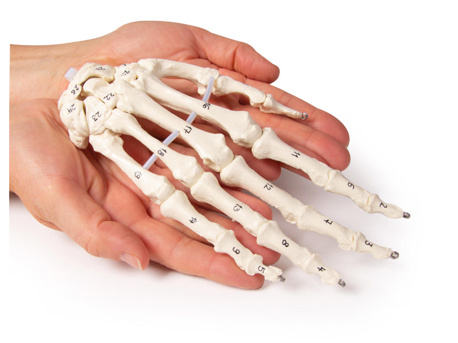 Håndskelet model med nummerering af knogler