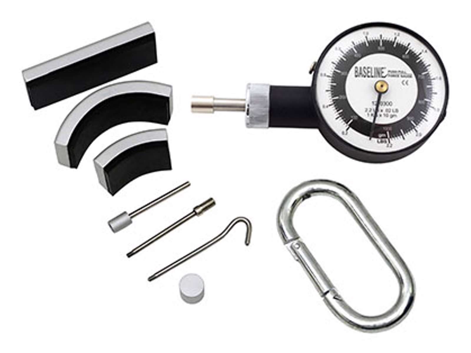 Baseline® MMT – Mekanisk manuel muskel tester fra USA.  Denne muskeltester Inkluderer 3 dele til at skubbe med, og 2 dele til og træk samt diverse snaplås kroge.