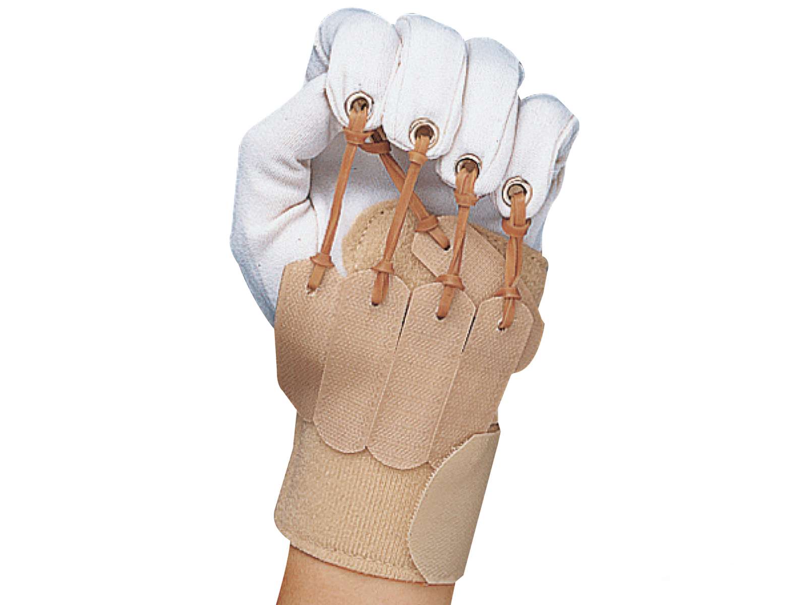 - Øjer på fingerspidserne: Mulighed for fastgørelse af elastik, der øger fleksionseffekten.