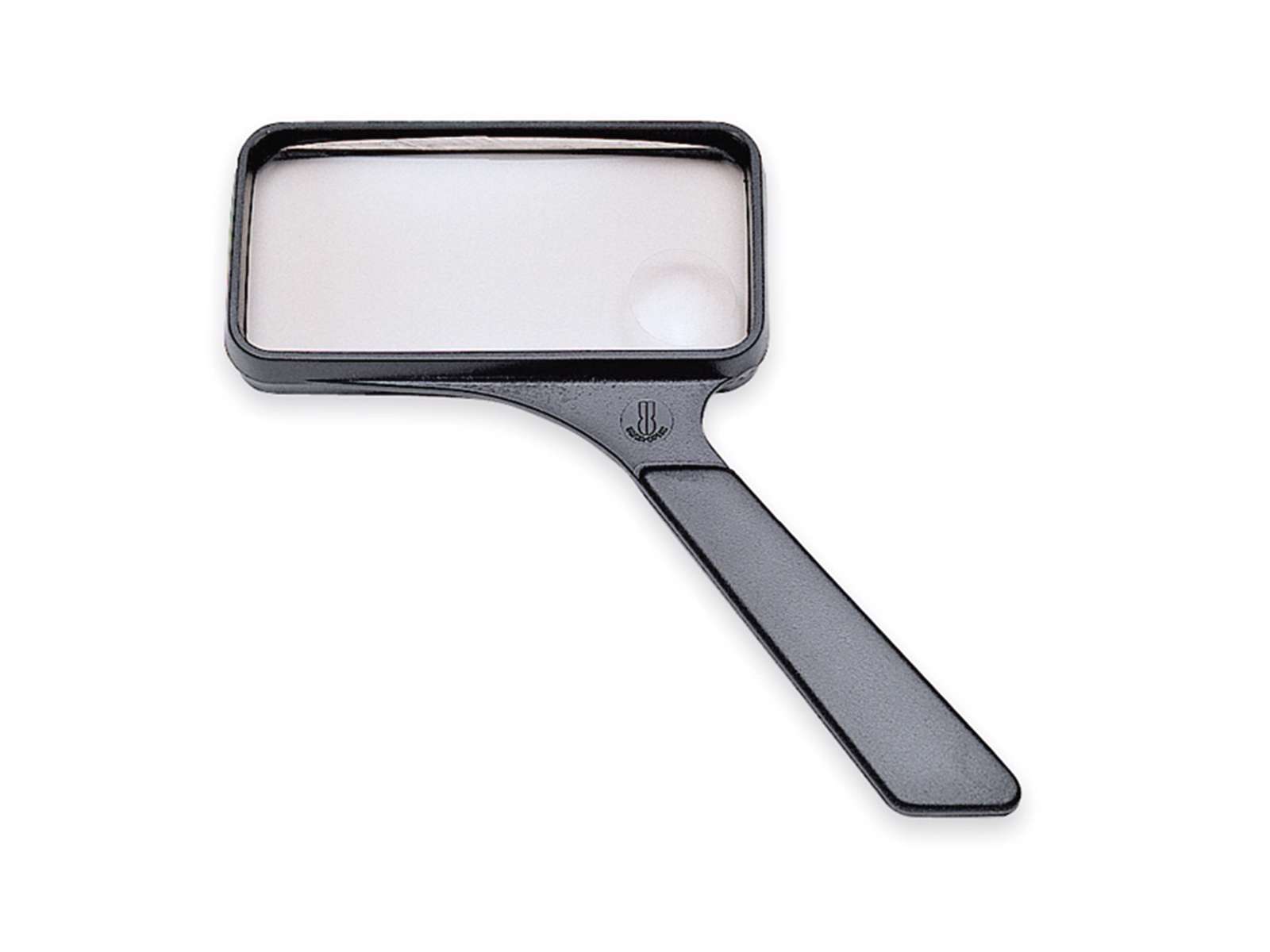 Denne rektangulære lup giver 2 gange forstørrelse og har et bifokalt glas, der giver 5 gange forstørrelse.
