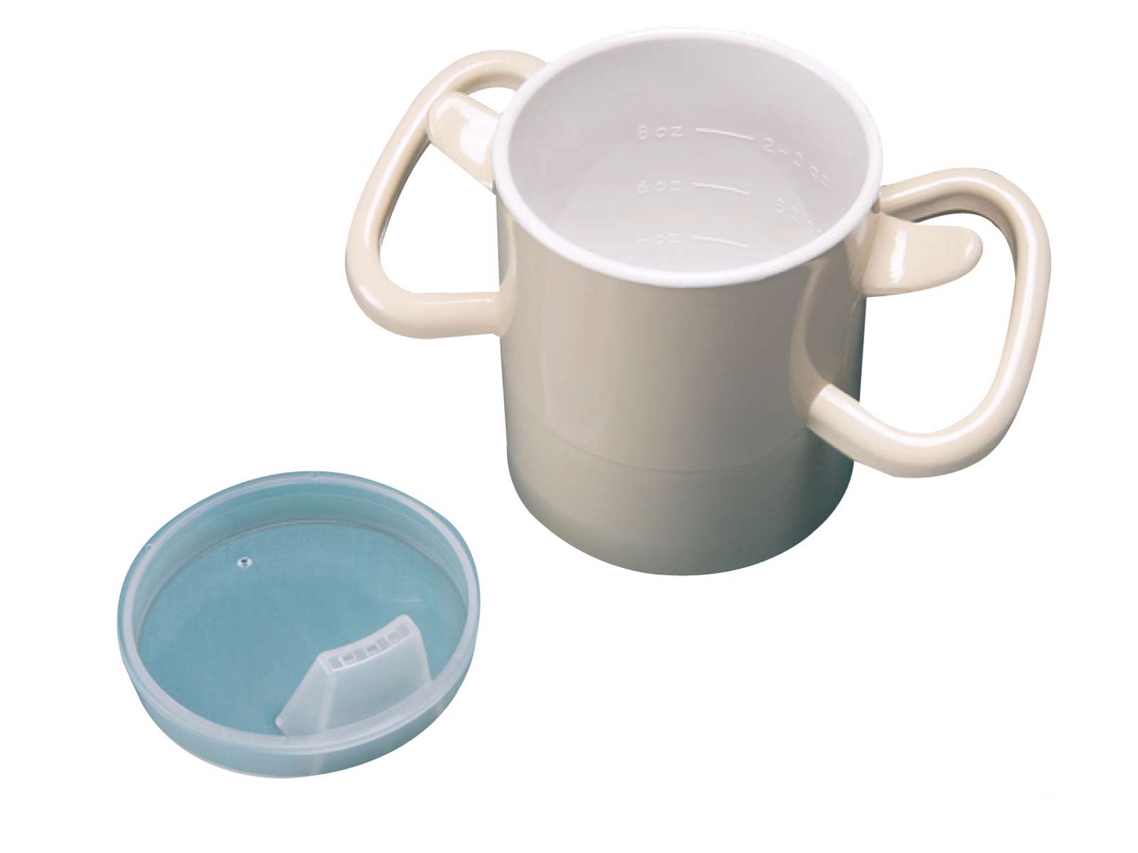 Denne kop har to behagelige håndtag, der gør den utrolig nem at drikke af. Egnet til personer med gigt. Koppen er lavet af støbt plastik der gør at væsken i koppen enten forbliv er køligere eller varmer alt efter type. Koppens ydre er dog stadig behagelig at holde om.