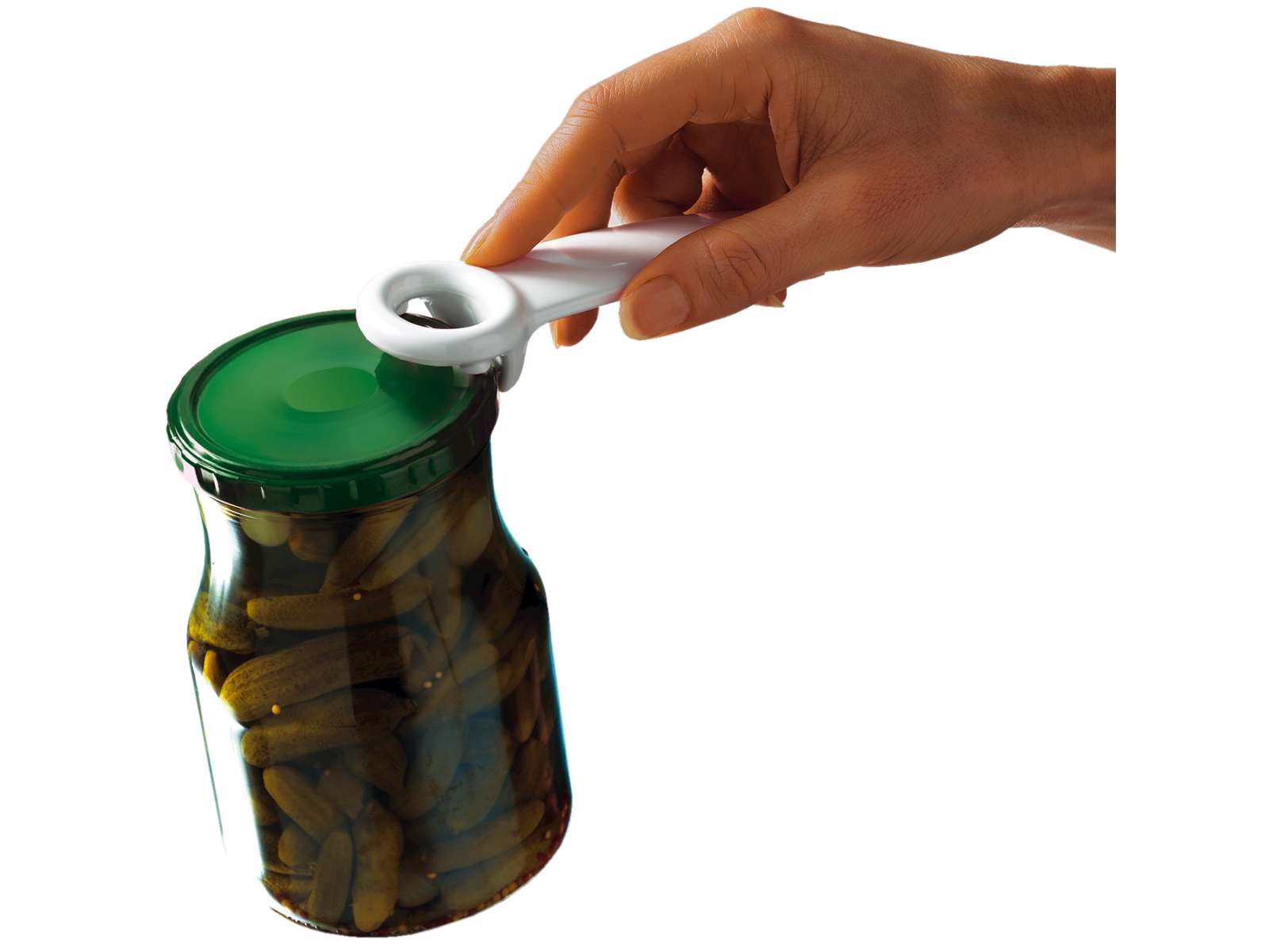JarKey lågåbner hjælper med åbning af låg på konservesglas, der ellers kan være svært , hvis man har nedsat kraft i hænderne.