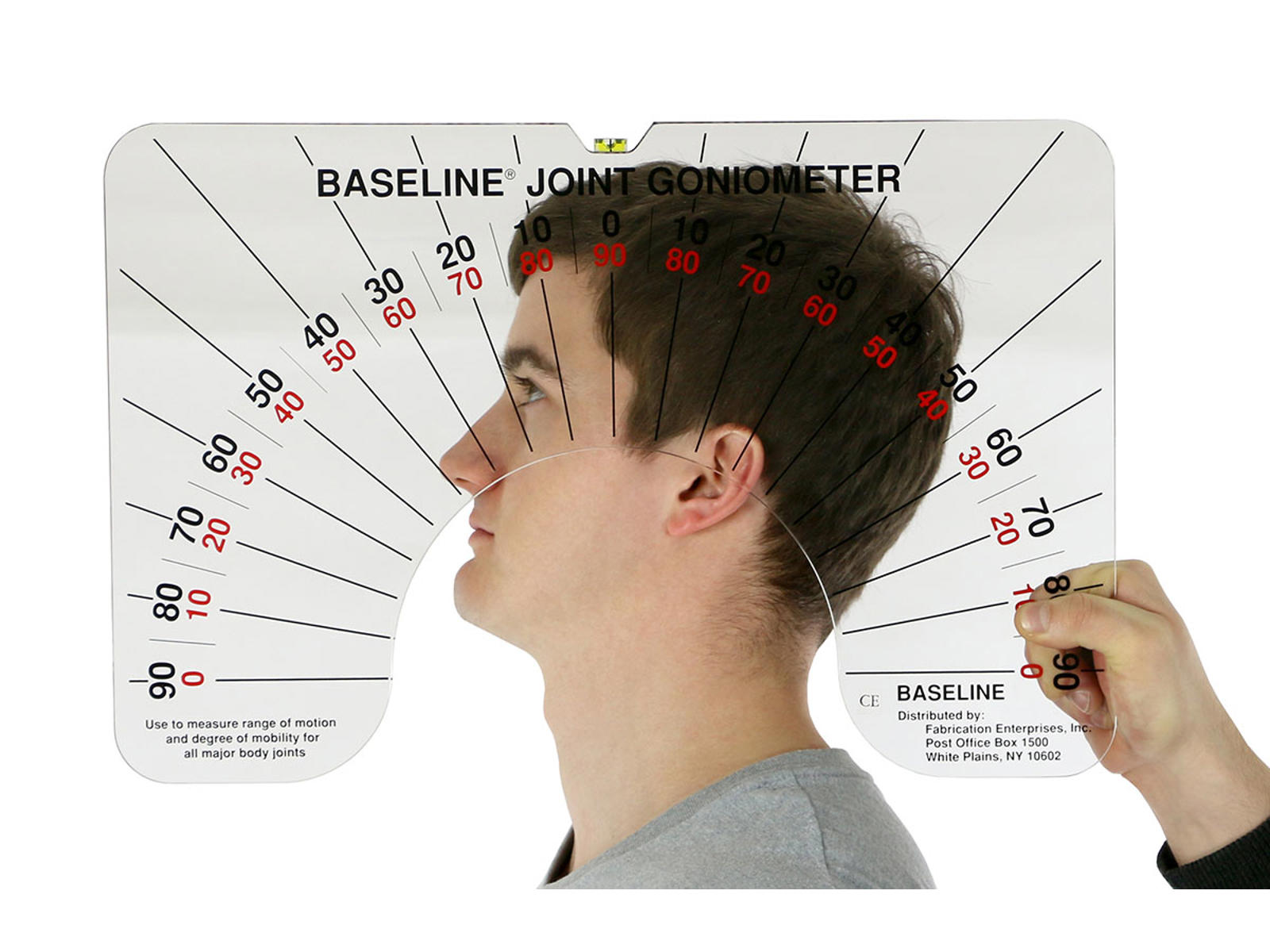 Mål bevægelsesomfanget for alle større led, cervical rotation, lateral fleksion af hovedet og anterior-posterior cervical fleksion. En vaterpas sikrer, at målingen foretages i en vandret plan. To 180 graders modsatrettede skalaer i 5 graders intervaller.