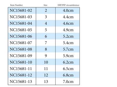 Rustfri stål Sterling Sølv DIP/PIP Størrelse NC15681-02 NC15685-02 4,0 cm 2 NC15681-03 NC15685-03 4,4 cm 3 NC15681-04 NC15685-04 4,6 cm 4 NC15681-05 NC15685-05 4,9 cm 5 NC15681-06 NC156 85-06 5,2 cm 6 NC15681-07 NC15685-07 5,4 cm 7 NC15681-08 NC15685-08 5,7 cm 8 NC15681-09 NC15685-09 5,9 cm 9 NC15681-10 NC15685-10 6,2 cm 10 NC15681-11 NC15685-11 6,5 cm 11 NC15681-12 NC15685-12 6,8 cm 12 NC15681-13 NC15685-13 7,0 cm 13