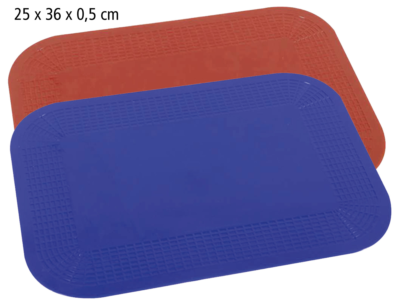 Det skridsikre underlag fra Dycem forhandles i størrelserne 25 x 18 x 0,3 cm, 38 x 45 x 0,3 cm samt 25 x 36 x 0,5 cm i farverne rød og blå.