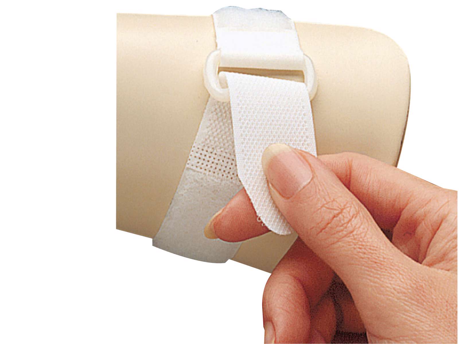 • Fremstillet af Velcro hook og loop strop med en D-ring i den ene ende. D-ringen giver mulighed for at justere spænding, for at sikre skinnen forbliver hvor den skal sidde. Velegnet til personer som uafhængigt selv skal kunne tage skinn e af og på. Kan håndvaskes og lufttørres. Pakket med 10 stk. i en pakke.